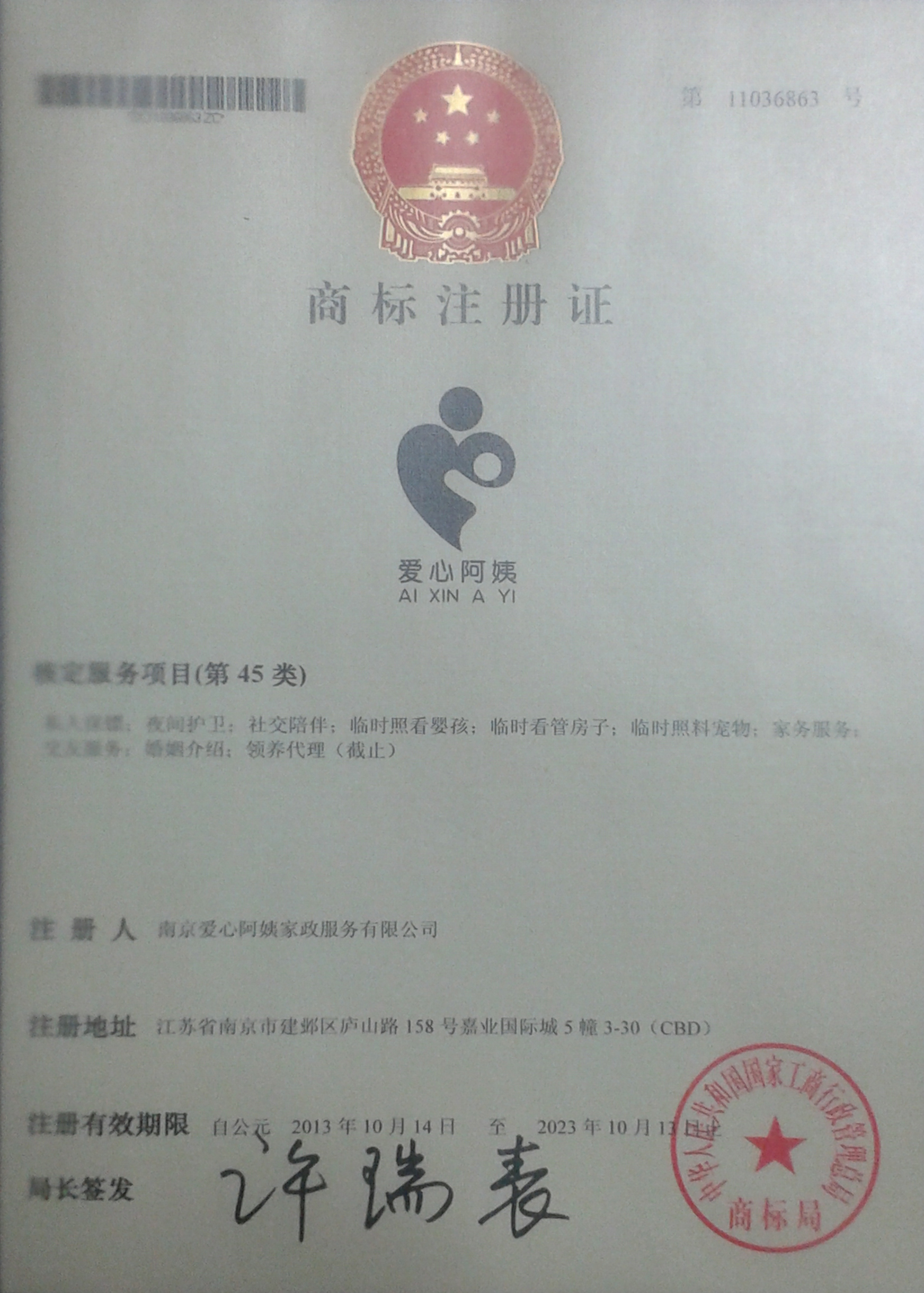 南京爱心阿姨家政的商标已经成为注册商标