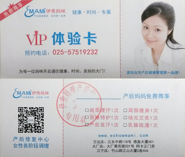 增值服务:凡在我们公司定月嫂的客户,均可以获得由我们的合作伙伴-----来自台湾产后管理第一品牌“伊秀妈咪”提供的免费产后修复体验卡一张,可享受免费上门服务一次! |