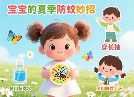除了前文提到的高温环境及二氧化碳较浓的地方之外,蚊子也容易被汗液的味道所吸引,所以当宝宝在户外奔跑的时候,千万不要因为所处的地方非山区而轻易忽略,爸爸妈妈必须定时帮宝宝擦汗,降低被叮咬的机率。若在山区旅游,尽量别让宝宝在早晨5点~7点及下午4点~7点这段期间,到草丛或积水较多的区域活动,因为这些时段是蚊子活动最旺盛的期间;服装方面则须避免让宝宝穿着深色衣服,建议以素色的长袖服装为主,并于四肢喷洒适量的婴幼儿专用防蚊液,如果家长有携带娃娃车,也可以在娃娃车的外围加装一层蚊帐,增强防护网。至于室内预防方面,平时应注意盆栽、澡盆或花瓶等容器,有无积水等情况,以免孑孓滋生,纱门与纱窗也要定时修护,避免出现破洞情形;水槽及水沟等场所则须定期排水,才能有效减少蚊虫繁殖。